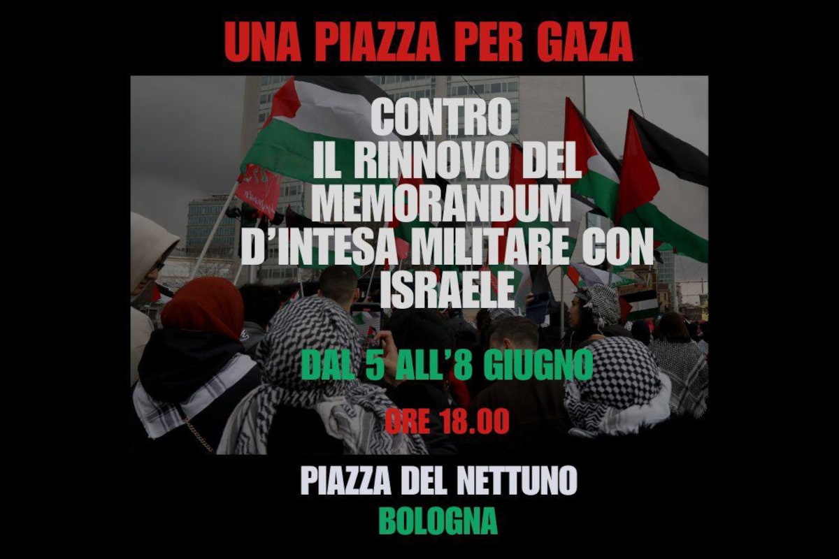 Da questo pomeriggio e almeno fino a domenica 8 giugno, in piazza Nettuno a Bologna, un gruppo di soggetti, tra cui il coordinamento Bologna per la Palestina, realizzeranno una piazza permanente. L’idea è quella di far confluire in piazza, in una sorta di lunga maratona, tutte le mobilitazioni che si stanno registrando in questi giorni per porre fine al genocidio a Gaza e per scongiurare il rinnovo automatico del Memorandum militare Italia-Israele che scade domenica prossima.