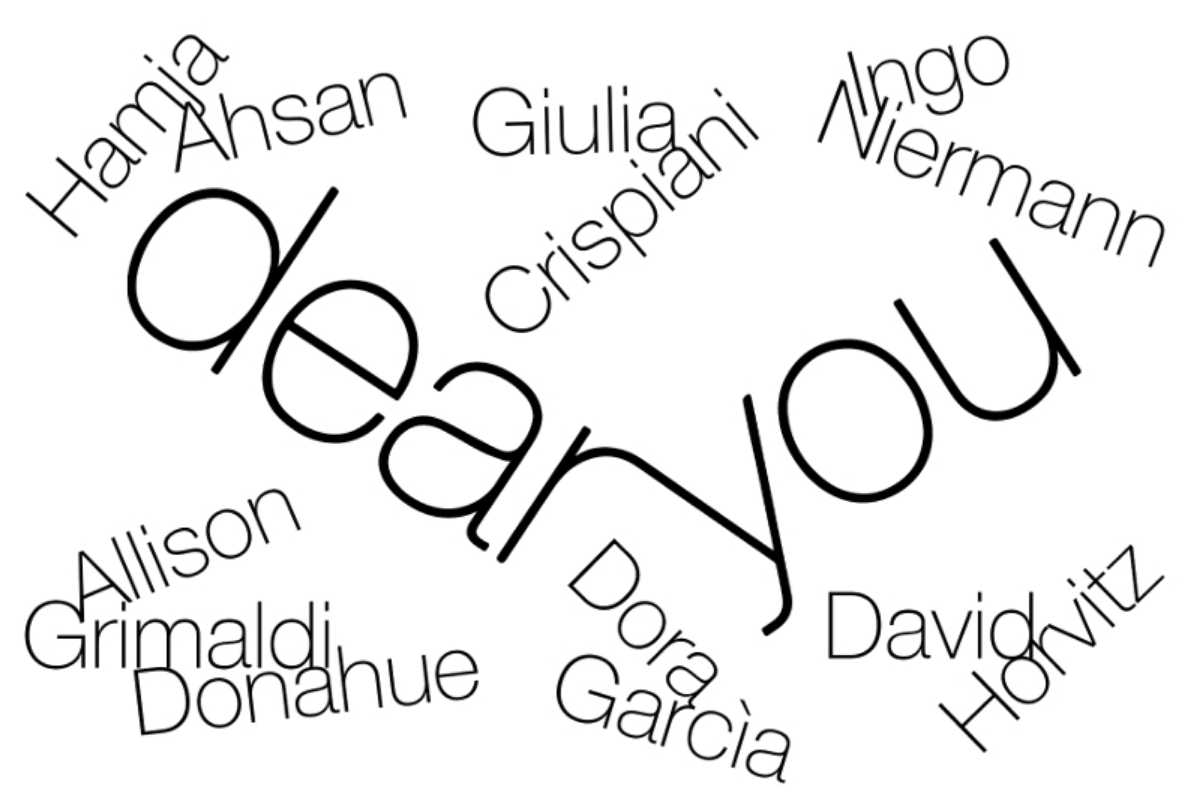 Il MAMbo raccoglierà per un mese gli indirizzi postali degli interessati. Per poter partecipare, basta recarsi sul loro sito dove verranno esplicate tutte le modalità di partecipazione, i costi e le scadenze. Dear You è aperta a tutti e tutte, ed anzi cerca di superare i confini geografici: l’internazionalità emerge anche e soprattutto dalla provenienza dei sei artisti, quali Hamja Ahsan (Londra), Giulia Crispiani (Italia), Dora Garcìa (Spagna), Allison Grimaldi Donahue (USA), Da (USA), Ingo Niermann (Germania).