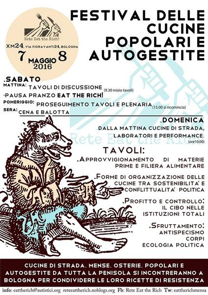 Inaugura domani a Xm 24 il primo “Festival delle Cucine Popolari Autogestite”, la due giorni lanciata dalla Rete Eat the Rich per “rivendicare e organizzare l’accesso per tutt* a un cibo genuino, il più possibile fuori dalle logiche di mercato e libero dallo sfruttamento”, e a cui parteciperanno numerose realtà da tutta Italia.