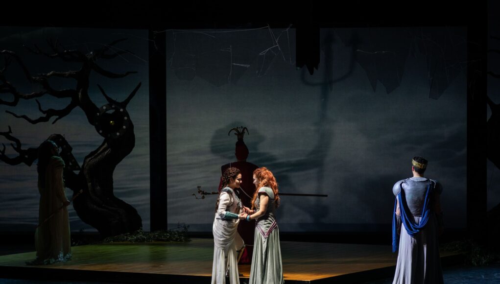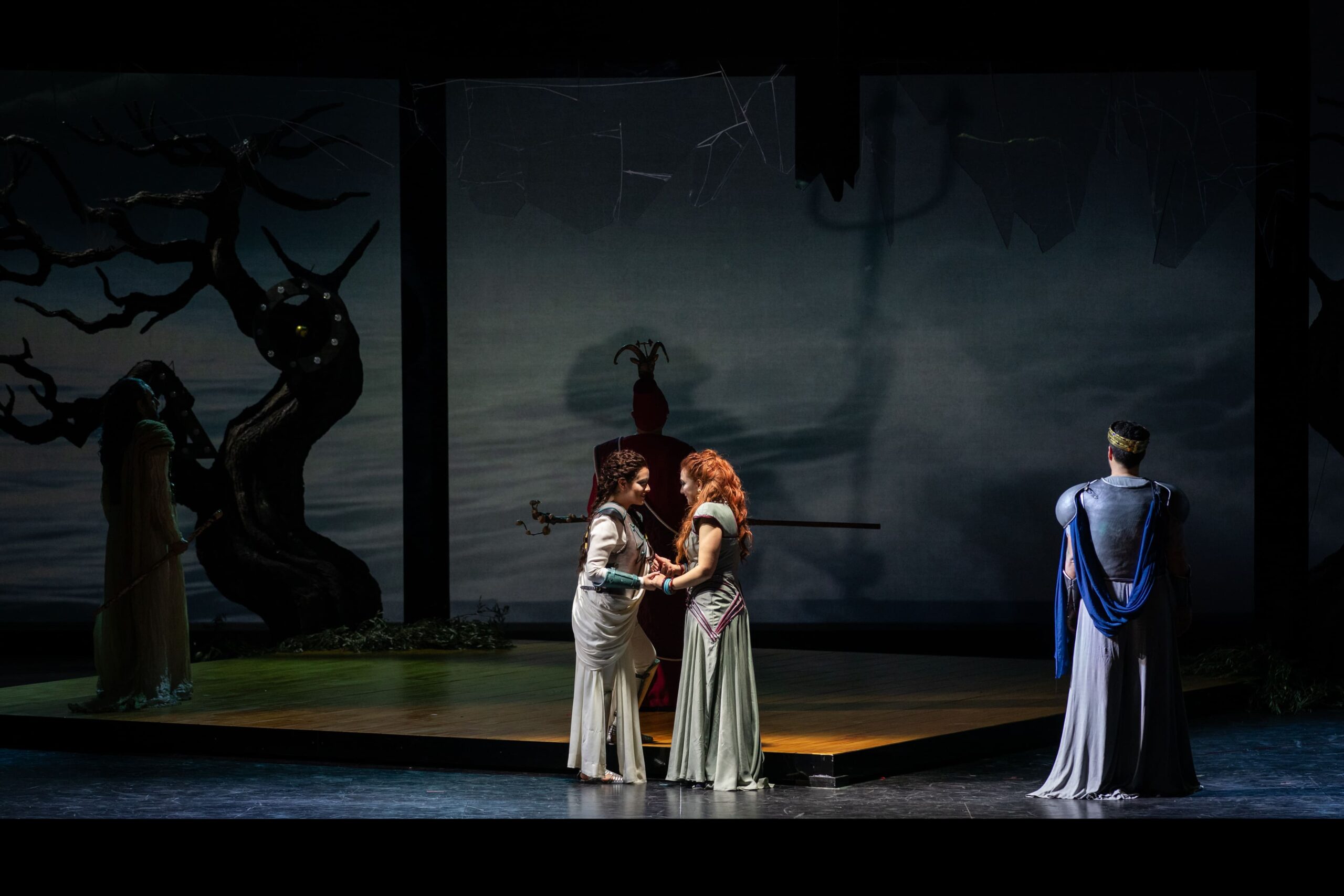 Il regista Mariano Bauduin ha fatto una scelta apprezzabile decidendo di percorrere la strada di un classicismo metafisico ispirandosi a quadri di De Chirico e Savino nella costruzione scenografica e nei costumi creando un’atmosfera onirica, in cui s’incontrano elementi delle nostre memorie classiche e mitologiche con forme stilizzate e geometrie novecentesche. C’è un grande senso del teatro con la mescolanza di stili e simboli in cui c’è posto per una maschera tragica greca, il labirinto cretese inciso in oro su una roccia e anche per la citazione del teatro d’ombre cinese con le sue sagome di draghi di carta, rette con pali da comparse o danzatori a creare danze del drago e battaglie. Bello l’uso della metonimia, la parte per il tutto, con l’uso di una piccola vasca in scena la cui acqua viene agitata dal dio Nettuno per narrare la tempesta che infuria sulle coste dell’Isola davanti al popolo (il coro) terrorizzato. Molto curati i costumi di Marianna Carbone che seguono e si adattano molto bene all’evoluzione drammaturgica dei personaggi e ne rappresentano non solo il ruolo ma lo spirito, la temperatura emotiva tanto per Ilia prima schiava lacera e poi regale, che per Idomeneo scombussolato dalla furia del mare e poi splendente. Molto evocativo il costume di Elettra che condensa nelle sue forme e colori quando sappiamo di questo personaggio nelle diverse rappresentazioni sia classiche che novecentesche. Bellissimi i costumi del coro che rappresentano il popolo cretese come anche il costume rosso delle ancelle che in alcuni momenti quasi danzati evocano forse le parche che srotolano i loro fili e che un giorno prestabilito taglieranno.