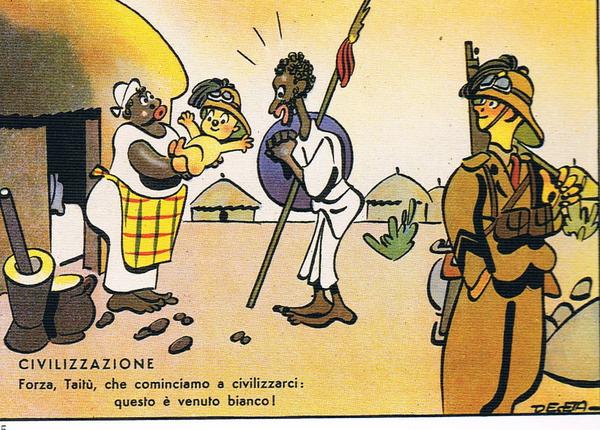 Abbiamo già analizzato nel nostro spazio radiofonico come l’ideologia fascista avesse fin dall’inizio una violenta vocazione al razzismo, allo sciovinismo ed alla cultura della belligeranza. La stessa immagine qui riportata sottolinea la “perfetta” sintesi della pedagogia mussoliniana, con un mix di razzismo, sessismo ed imperialismo, dove uno stupro di guerra è considerato “civilizzazione“.