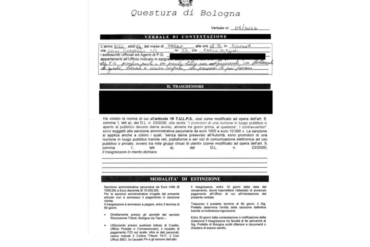 Nelle motivazioni per la sanzione si fa riferimento al comma 1 dell’articolo 9 del Decreto Sicurezza (dl 23/2026), che dice: «La sanzione di cui al presente comma si applica anche a coloro i quali, senza darne preavviso all’Autorità, sono promotori, ai sensi del primo comma, di una riunione in luogo pubblico tramite reti, piattaforme e servizi di comunicazione elettronica ad uso pubblico o privato, ovvero tramite gruppi chiusi di utenti». Nel decreto la sanzione va dai 1000 ai 10.000 euro.