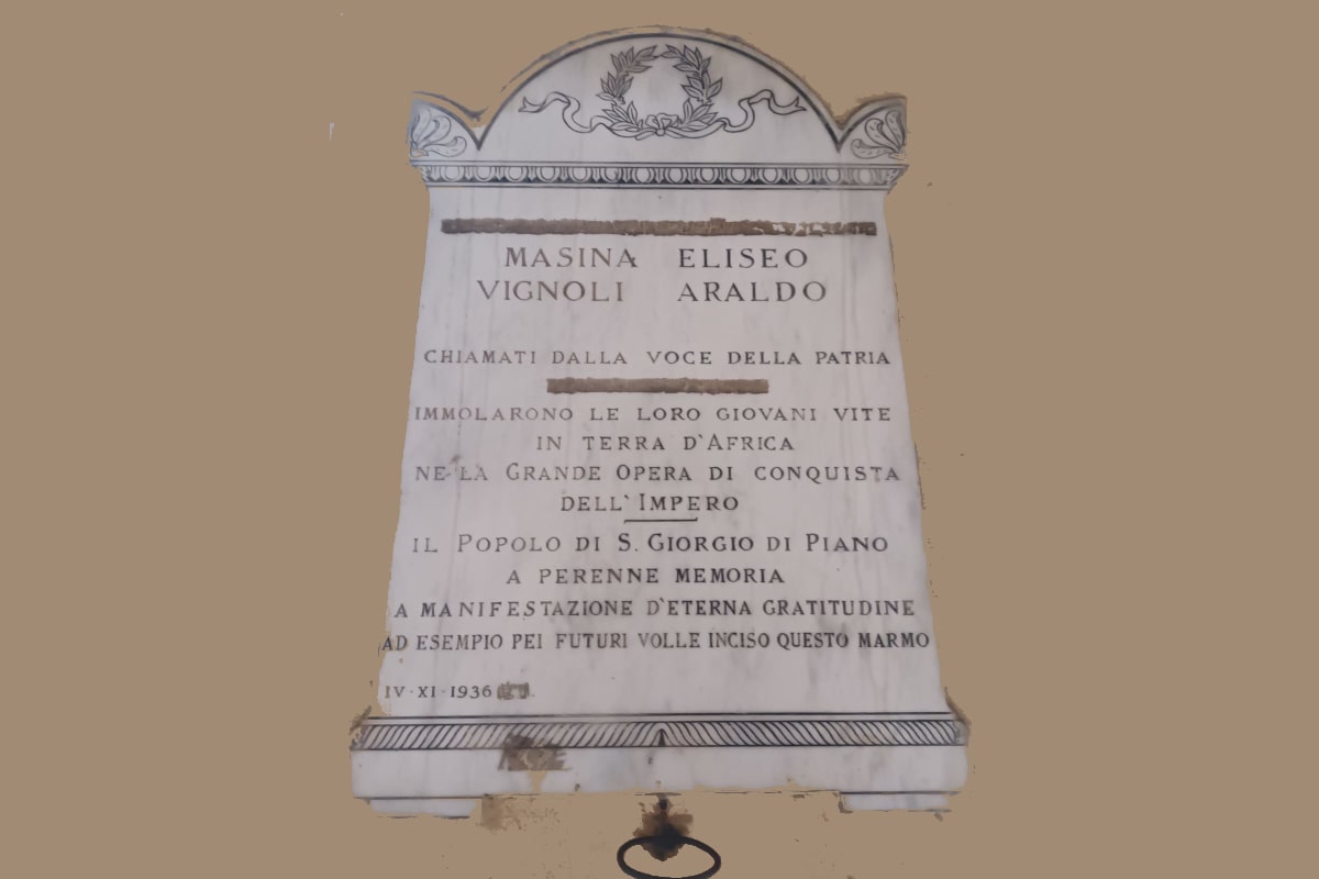 «Quella lapide fu modificata dopo il 25 aprile – racconta Mattia Zucchini, assessore alla Cultura di San Giorgio di Piano – ma furono tolti soltanto i riferimenti al fascismo, mentre non c’era ancora una sensibilità che si opponesse al colonialismo italiano e ai suoi crimini».