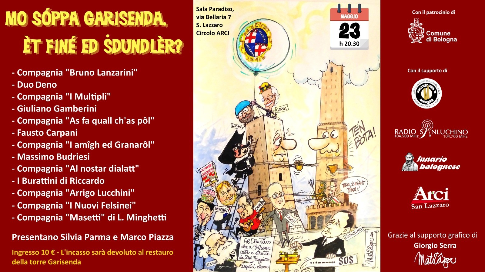 Fin dal titolo “Mo sóppa Garisenda, èt finé ed sdundlèr?” (Su Garisenda, la finisci di oscillare?, ndr) emerge il legame intimo che i rappresentati delle arti tradizionali bolognesi hanno con la Garisenda alla quale si rivolgono direttamente e in dialetto. E il bolognese sarà la lingua che unirà tutte le performance degli artisti che si esibiranno giovedì alle 20.30 in via Bellaria 7 a San Lazzaro. Una serata di danze, come la filuzza, sketch, canzoni, monologhi, zirudelle che intratteneranno il pubblico. «Volevamo dare un contributo concreto – ha spiegato Piazza – quindi abbiamo pensato a una raccolta fondi. Tanti saranno gli ospiti. Otto compagnie di teatro dialettale, Giuliano Gamberini, Fausto Carpani, Massimo Budriesi e Riccardo Pazzaglia con i suoi burattini presteranno la loro arte alla città e il ricavato dei biglietti andrà nel fondo per il restauro della Garisenda. Allo stesso modo sarà possibile comprare i gadget dell’iniziativa come la maglietta con la locandina dello spettacolo, disegnata da Giorgio Serra», ha concluso Piazza.