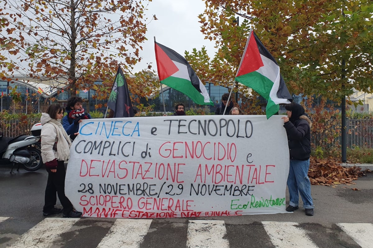 Questa mattina un gruppo di attivisti, riuniti sotto la sigla “Ecoresistenze”, ha organizzato un presidio davanti al Tecnopolo di Bologna per denunciare la complicità tra il consorzio interuniversitario Cineca, il Tecnopolo e la multinazionale del settore della difesa Leonardo S.p.A., che collabora militarmente con Israele. Una collaborazione che rappresenterebbe un esempio di integrazione tra ricerca scientifica, profitto economico e industria bellica, con conseguenze negative sul fronte ambientale e sociale.