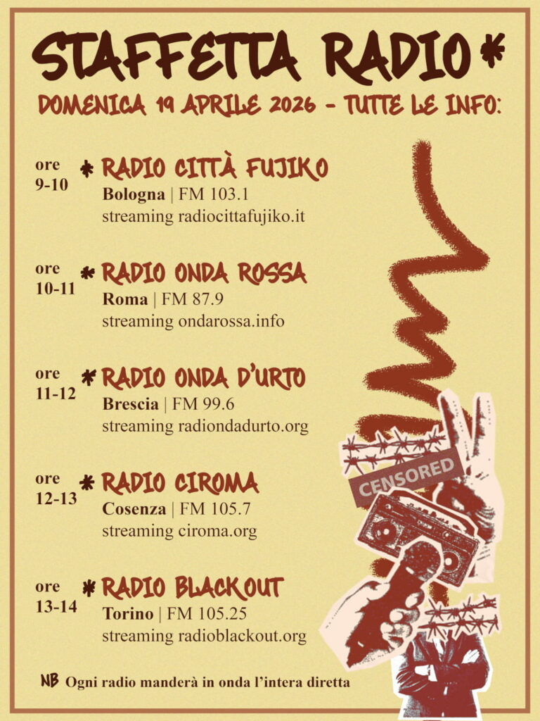 Domenica 19 aprile, dalle 9.00 alle 14.00, cinque radio indipendenti e di movimento italiane daranno vita a una staffetta radiofonica contro la censura e la repressione.