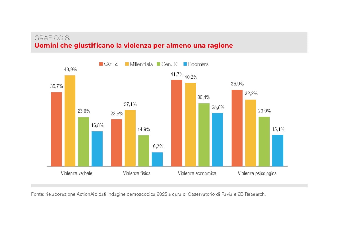 Dalla ricerca emerge che un uomo su tre considera accettabile la violenza economica, con picchi ancora maggiori tra i Millennials e la Gen Z. Uno su quattro ritiene comprensibile la violenza verbale o psicologica se provocata da comportamenti “scorretti” attribuiti alle donne. E mentre la generazione dei Boomer tende a negare l’esistenza stessa della violenza di genere, tra i giovani cresce una forma di legittimazione delle sue manifestazioni, comprese quelle fisiche: quasi due uomini adulti su dieci giudicano giustificabile la violenza fisica in alcune circostanze.